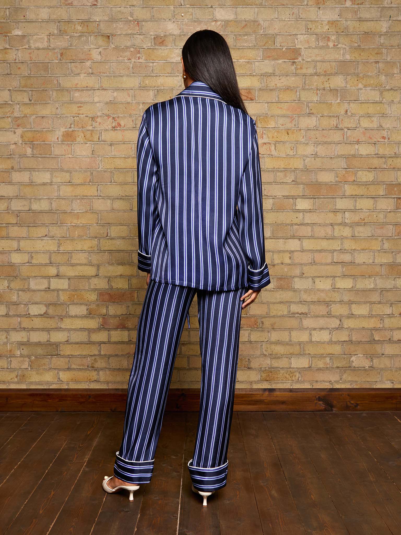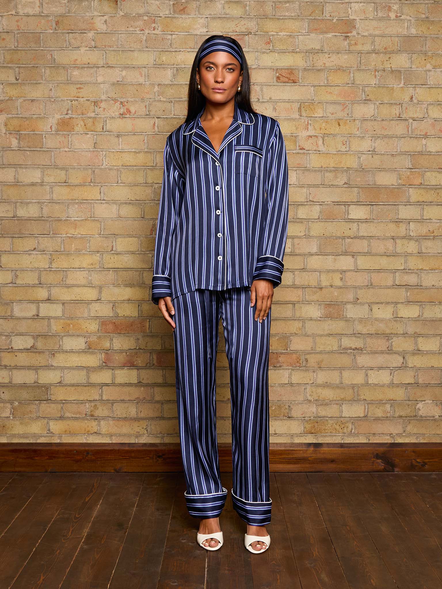 Sleek and timeless, Into the Blue pairs blue banana silk with crisp vertical stripes for a look that’s both classic and contemporary. The relaxed, piped pajama silhouette is elevated with a matching twilly scarf, creating an effortlessly refined set that transitions with ease from slow mornings to elegant evenings.